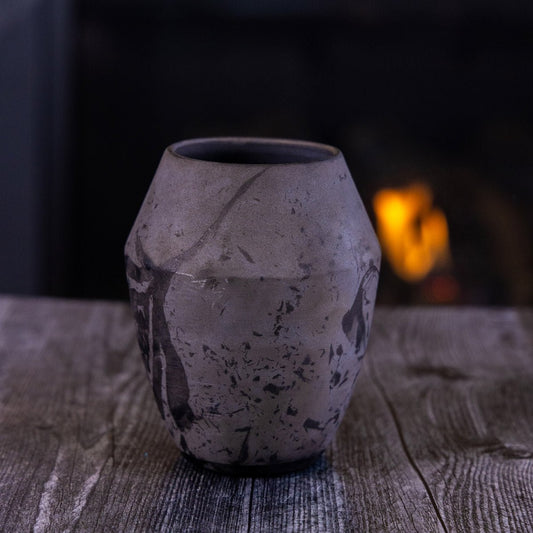Raku Hand-Carved Pot: Hand-Carved with Tarnished Silver Effect