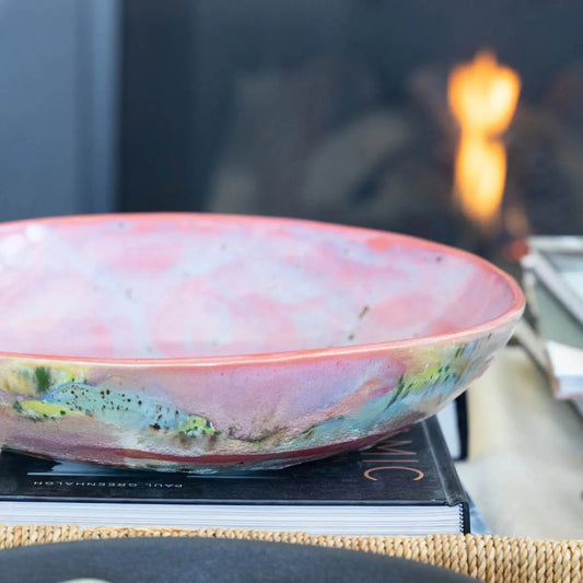 #23 XL Stoneware Abstract Art Exterior with Pinks and Blues Inside Decorative Serving Bowl (Color Spectrum Series)