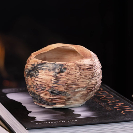 Pot #73 - Medium Manipulated Abstract Ridged Pot (Woodlike Stained Naked Pottery)
