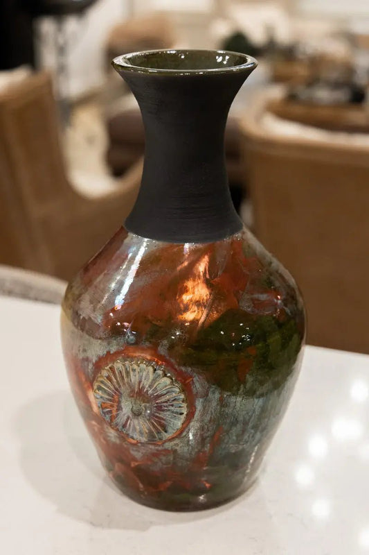 XL Raku Pottery Decorative Sunflower Pot (Coppers, Blacks, & Earthy Greens)
