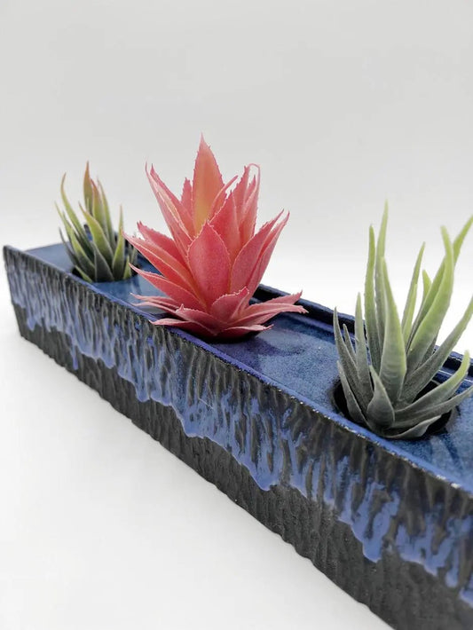 3-Plant Slab-Built Hand-Carved Planter (Extra-long midnight blue & black)