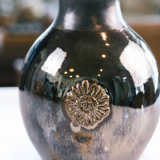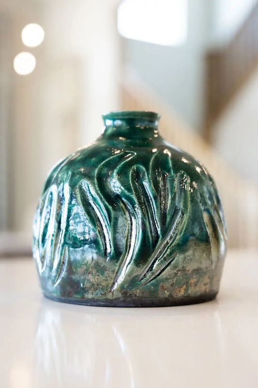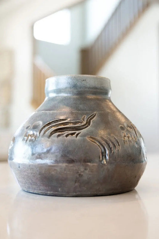 Raku Hand-Carved Pot: Hand-Carved with Tarnished Silver Effect