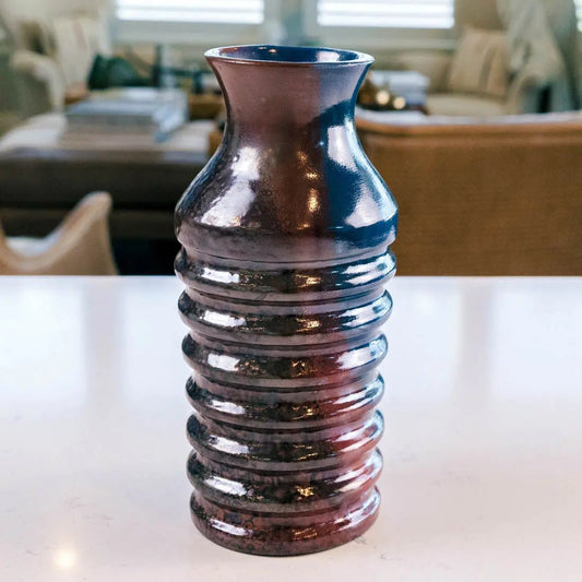 #45 Large Raku Decorative Ribbed Pot/Vase - Red Coppers & Cobalt - (Creative Collection)