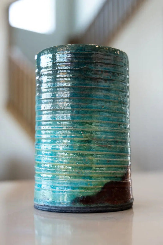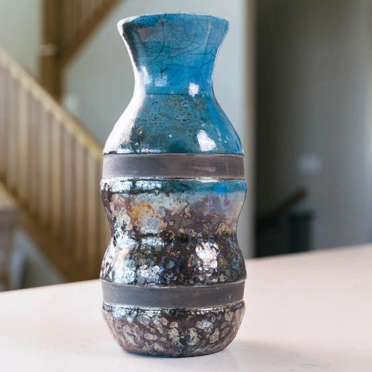 #46 Medium Raku Decorative Banded Pot/Vase - Turquoise & Spotted Chocolate - (Creative Collection)
